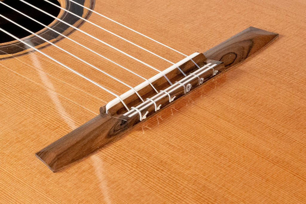 Cedar brings distinct tonal qualities to the instrument, offering immediate responsiveness and a warmer color compared to spruce. The wood produces strong fundamental tones with generous overtones, creating a complex harmonic profile. Cedar tops tend to open up quickly, requiring less playing time to reach their acoustic potential. The material's natural warmth complements the clarity provided by the lattice bracing structure.