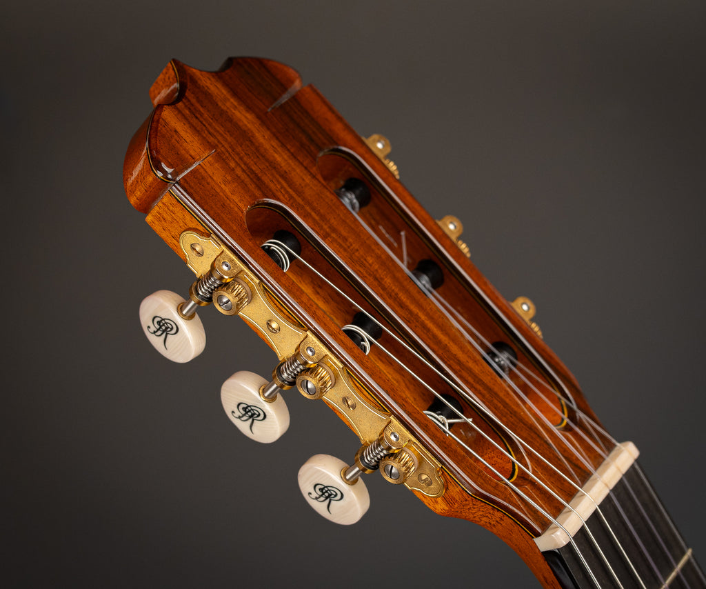 Built with carefully selected solid spruce for the top and Spanish cypress for the back and sides, the 1A delivers the classic flamenco blanca sound—bright, cutting trebles with immediate percussive attack and minimal sustain. The cypress's natural resonance creates the dry, crackling tone that flamenco players prize for its clarity and projection. The lighter bracing pattern enhances responsiveness, allowing for the explosive rasgueados and delicate picado runs that define the art form. A protective golpeador preserves the top during the rhythmic golpes essential to flamenco performance.